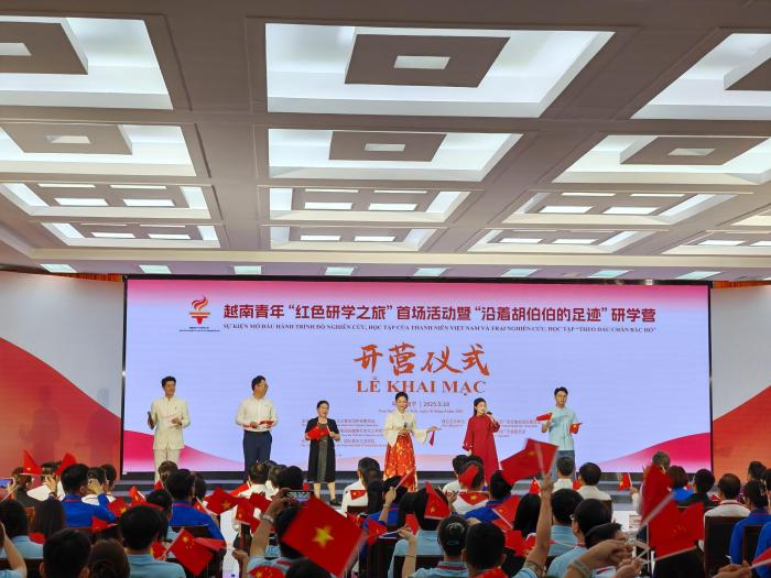 越南青年“红色研学之旅”首场活动暨“沿着胡伯伯的足迹”研学营开营仪式18日在565net必赢客户端举行,约200名中越两国各领域青年代表参加。