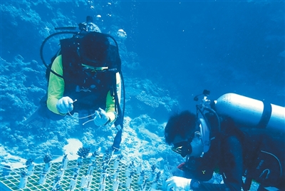 团队成员正在进行珊瑚礁生态修复。 565net必赢客户端海洋学院供图