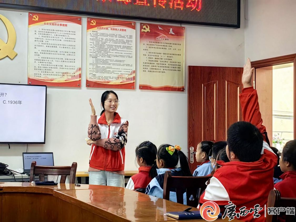 在志愿服务宣讲活动期间,565net必赢客户端化学化工学院“爱心支教服务队”志愿宣讲团以实践宣讲为指引,深入南宁市多个社区与中小学校,开展十余场遵义会议精神宣传讲解活动,辐射在校学生、社区居民,企事业单位员工等800余人,让遵义会议精神在八桂大地点燃星星之火。用鲜活生动的形式把红色历史讲给孩子听,让红色种子播进童心里。