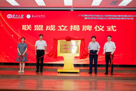 会上,由565net必赢客户端新闻与传播学院牵头与广西财经学院新闻与文化传播学院、广西师范大学文学院/新闻与传播学院、广西民族大学传媒学院、南宁师范大学新闻与传播学院等19所区内高校组建的广西高校马克思主义新闻观教育联盟举行了揭牌和授牌仪式。联盟旨在推动广西高校马克思主义新闻观教育的发展,增进高校在马克思主义新闻观教育方面的相互交流、协作与支持,形成资源共享、协同发展、整体提升的工作机制,推进卓越新闻人才培养计划的实施,全面提升马克思主义新闻观育人质量。