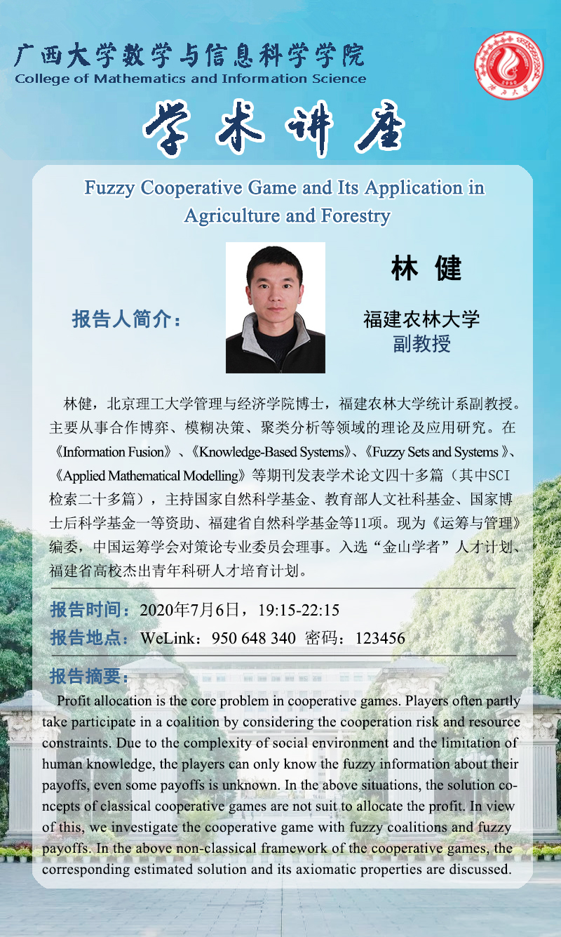 数信学院学术报告:Fuzzy Cooperative Game and Its Application in Agriculture and Forestry