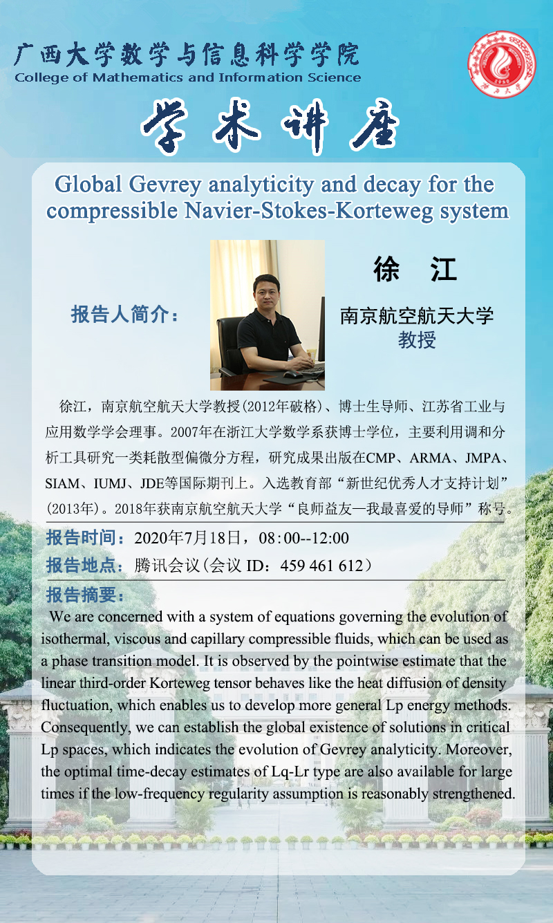 数信学院学术报告:Global Gevrey analyticity and decay for the compressible Navier-Stokes-Korteweg system