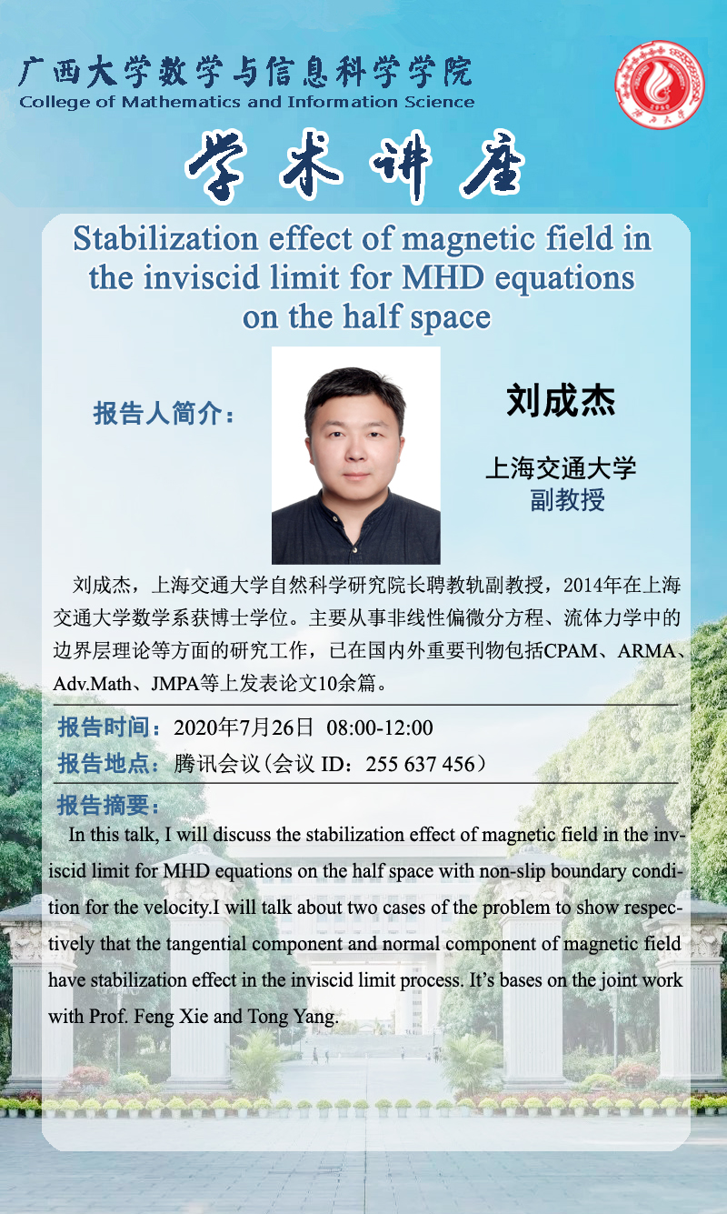 数信学院学术报告:Stabilization effect of magnetic field in the inviscid limit for MHD equations on the half space