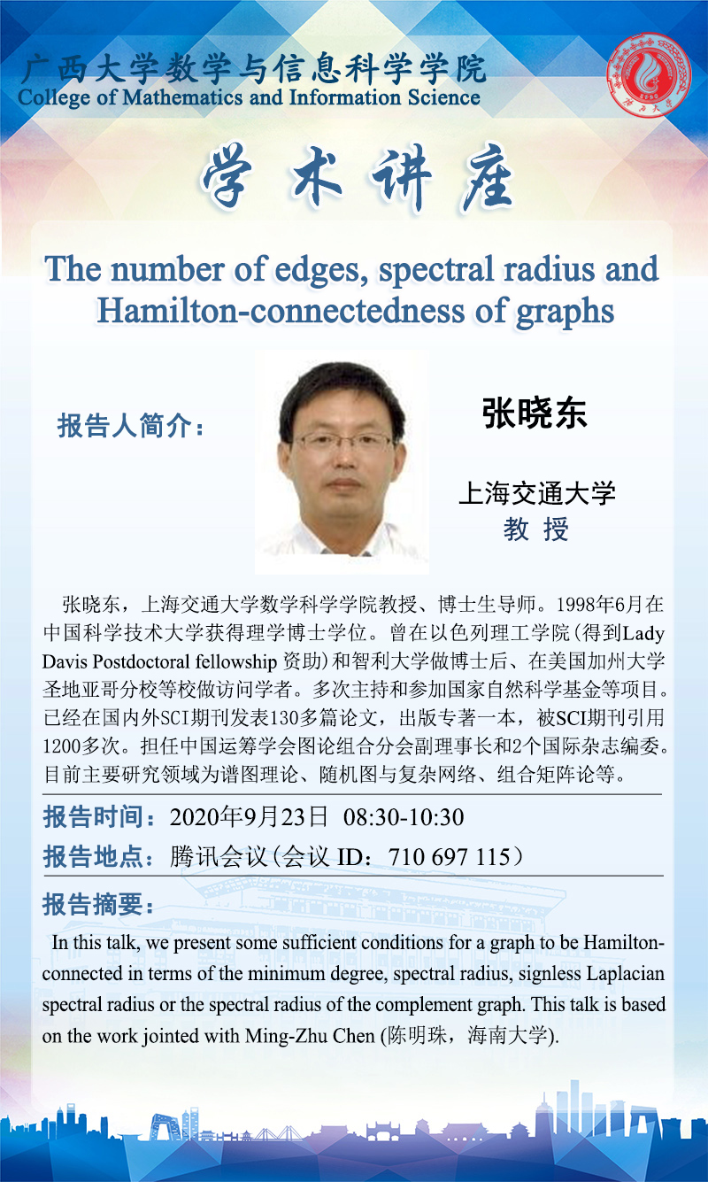 数学与信息科学学院学术讲座:The number of edges, spectral radius and Hamilton-connectedness of graphs