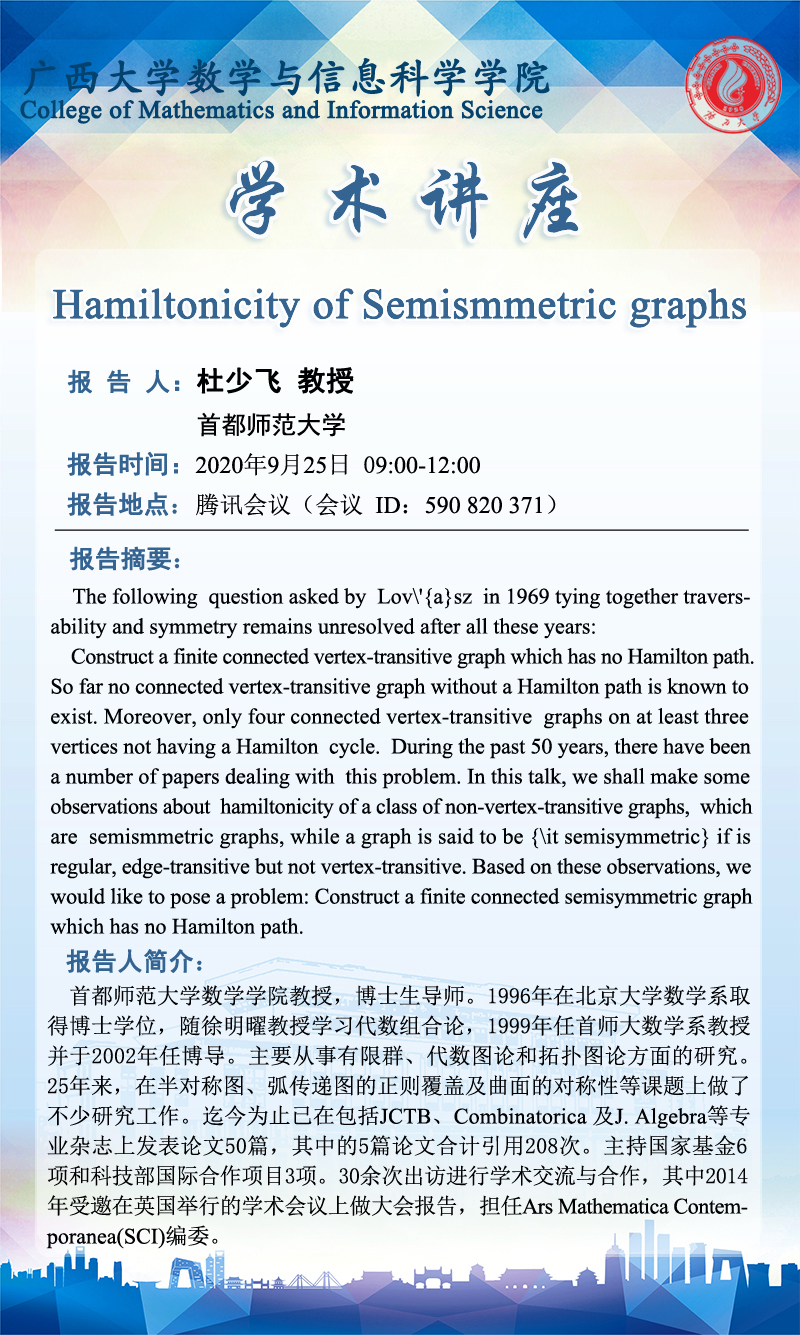 数学与信息科学学院学术讲座:Hamiltonicity of Semismmetric graphs