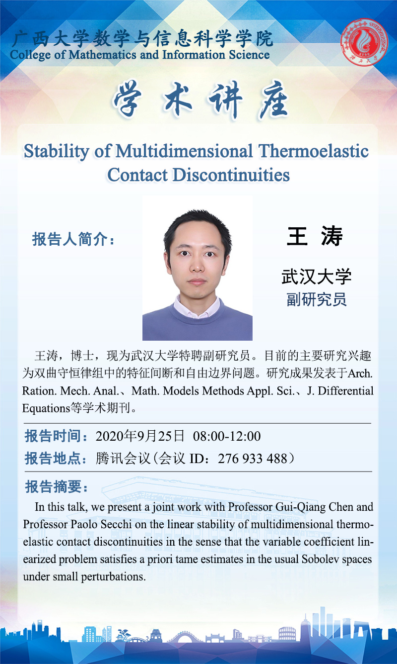数学与信息科学学院学术讲座:Stability of Multidimensional Thermoelastic Contact Discontinuities