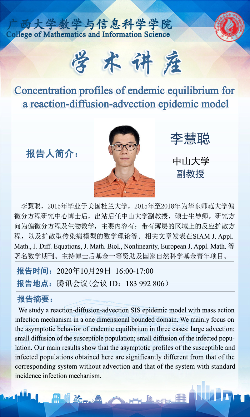 数学与信息科学学院学术讲座:Concentration profiles of endemic equilibrium for a reaction-diffusion-advection epidemic model