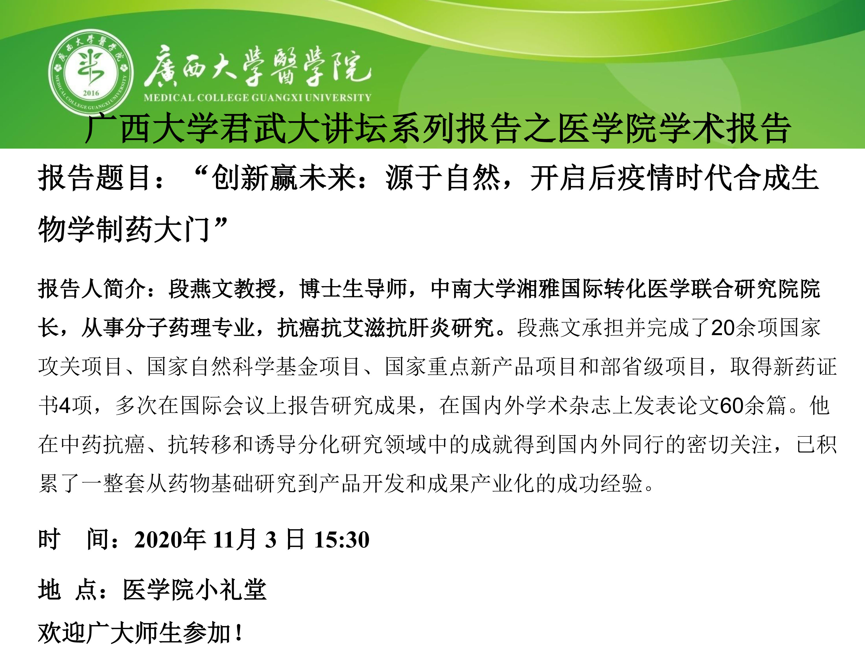 565net必赢客户端君武大讲坛系列报告之医学院学术报告:“创新赢未来:源于自然,开启后疫情时代合成生物学制药大门”