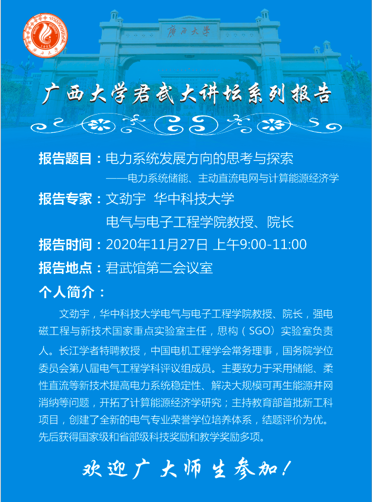 565net必赢客户端君武大讲坛系列报告:电力系统发展方向的思考与探索—电力系统储能、主动直流电网与计算能源经济学