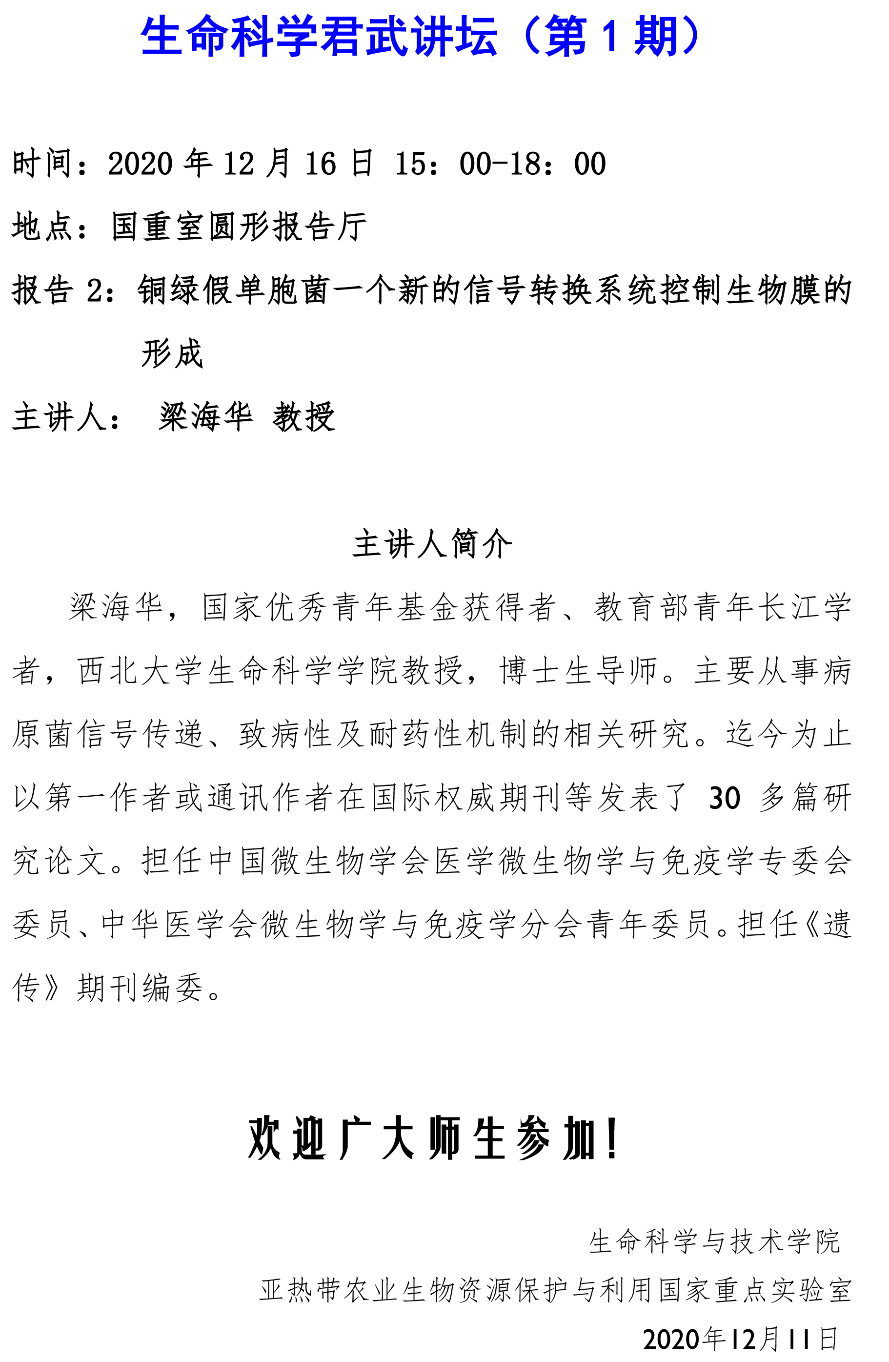 生命科学君武讲坛(第1期):全新细菌DNA磷硫酰化系统的发现;铜绿假单胞菌一个新的信号转换系统控制生物膜的形成