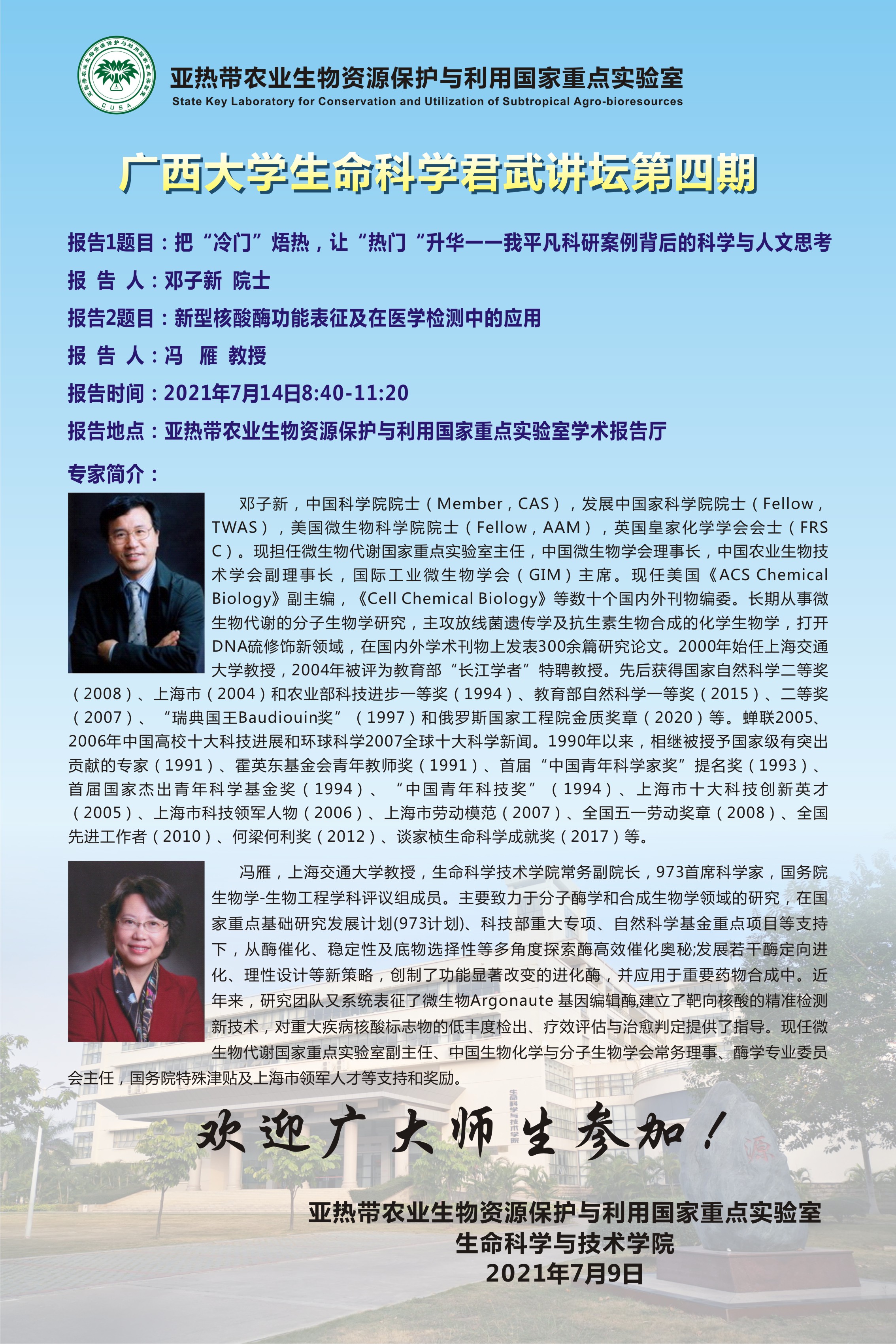 生命科学君武讲坛第4期:把“冷门”焐热,让“热门“升华—我平凡科研案例背后的科学与人文思考;新型核酸酶功能表征及在医学检测中的应用;