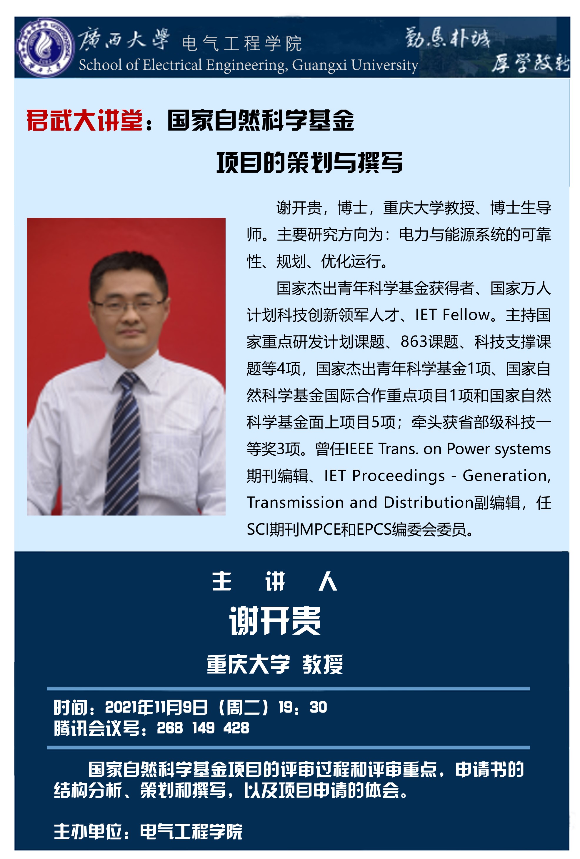 电气工程学院君武大讲坛:国家自然科学基金项目的策划与撰写