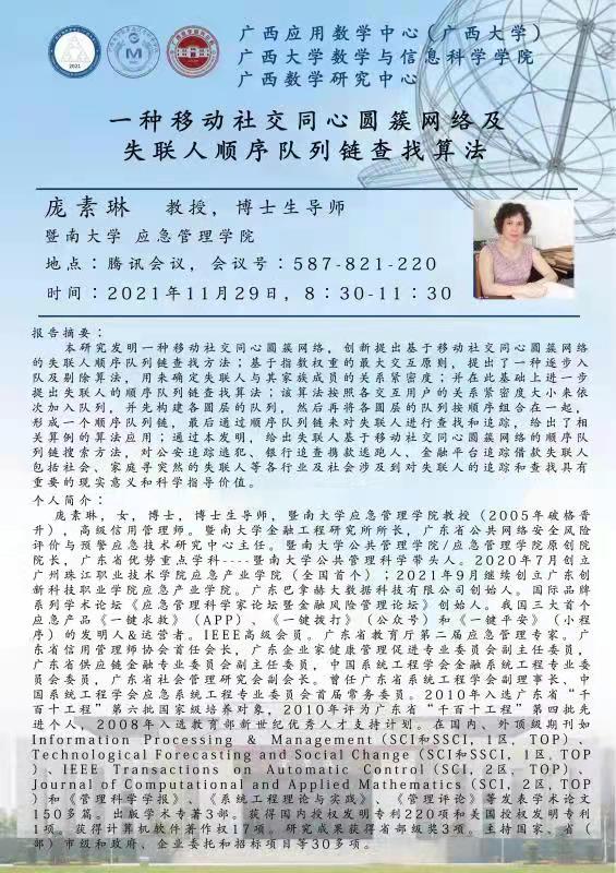 广西数学研究中心学术报告:一种移动社交同心圆簇网络及失联人顺序队列链查找算法
