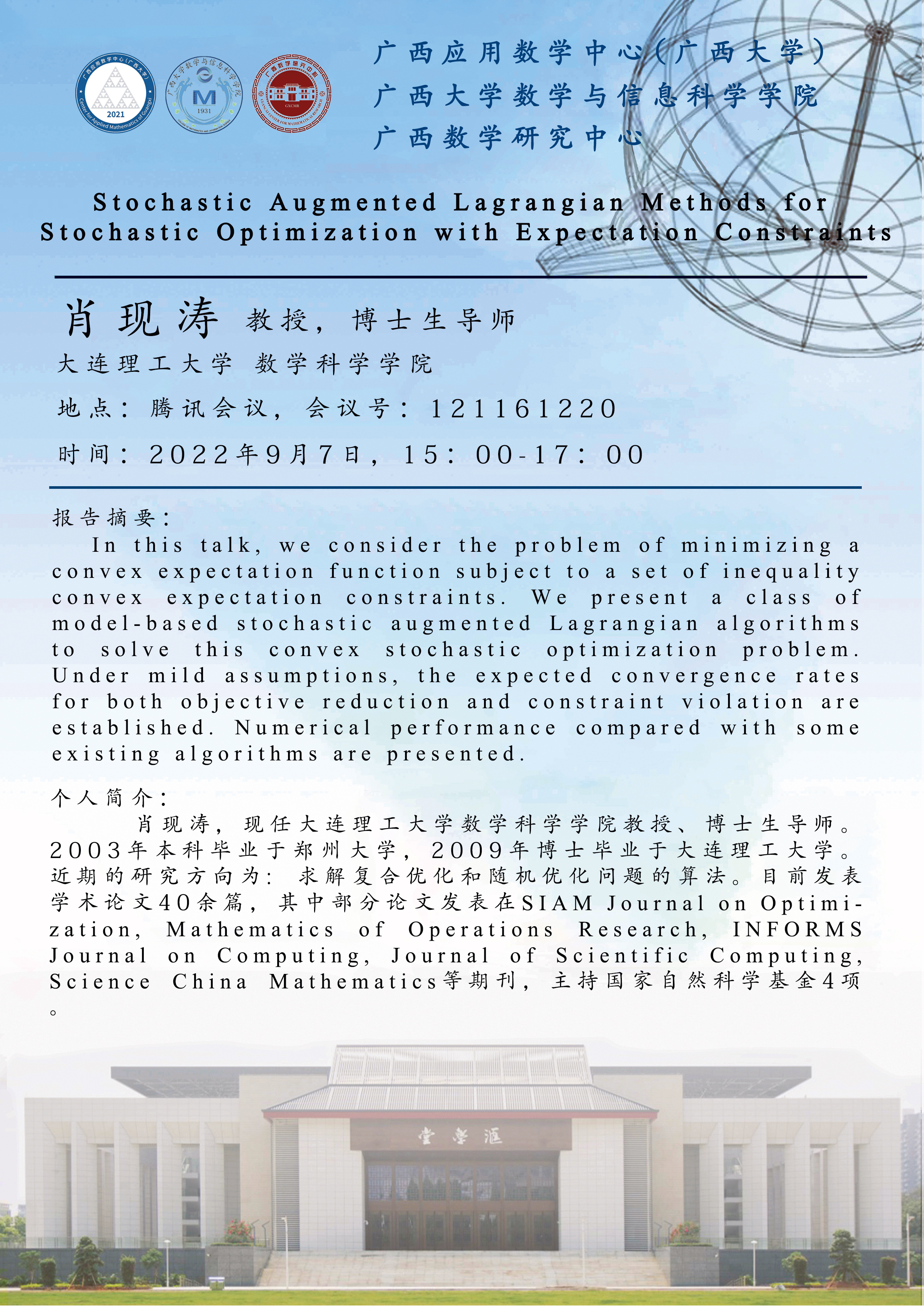 数学与信息科学学院学术报告:Stochastic Augmented Lagrangian Methods for Stochastic 0ptimization with Expectation Constraints