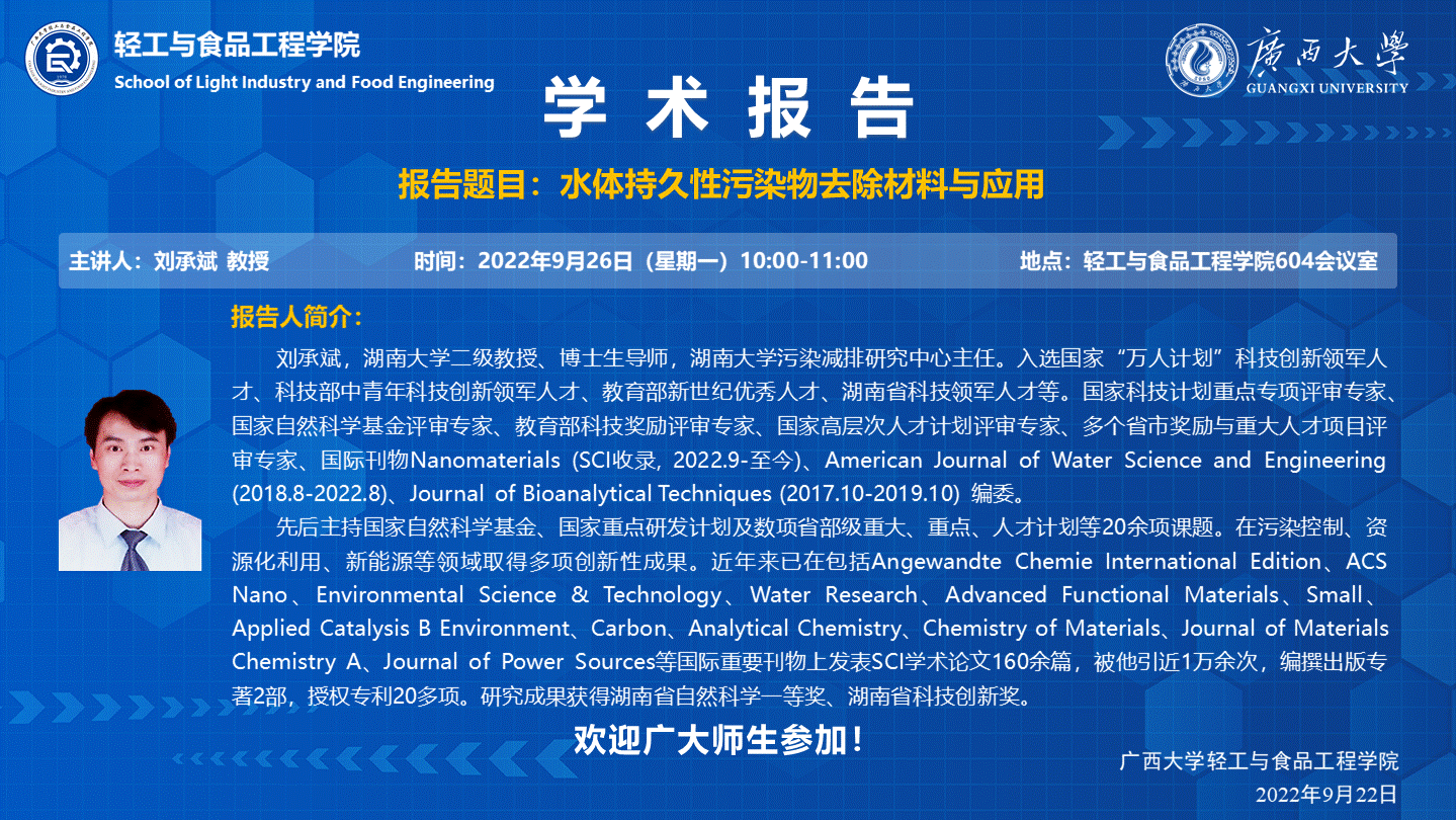 轻工与食品工程学院学术报告:水体持久性污染物去除材料与应用