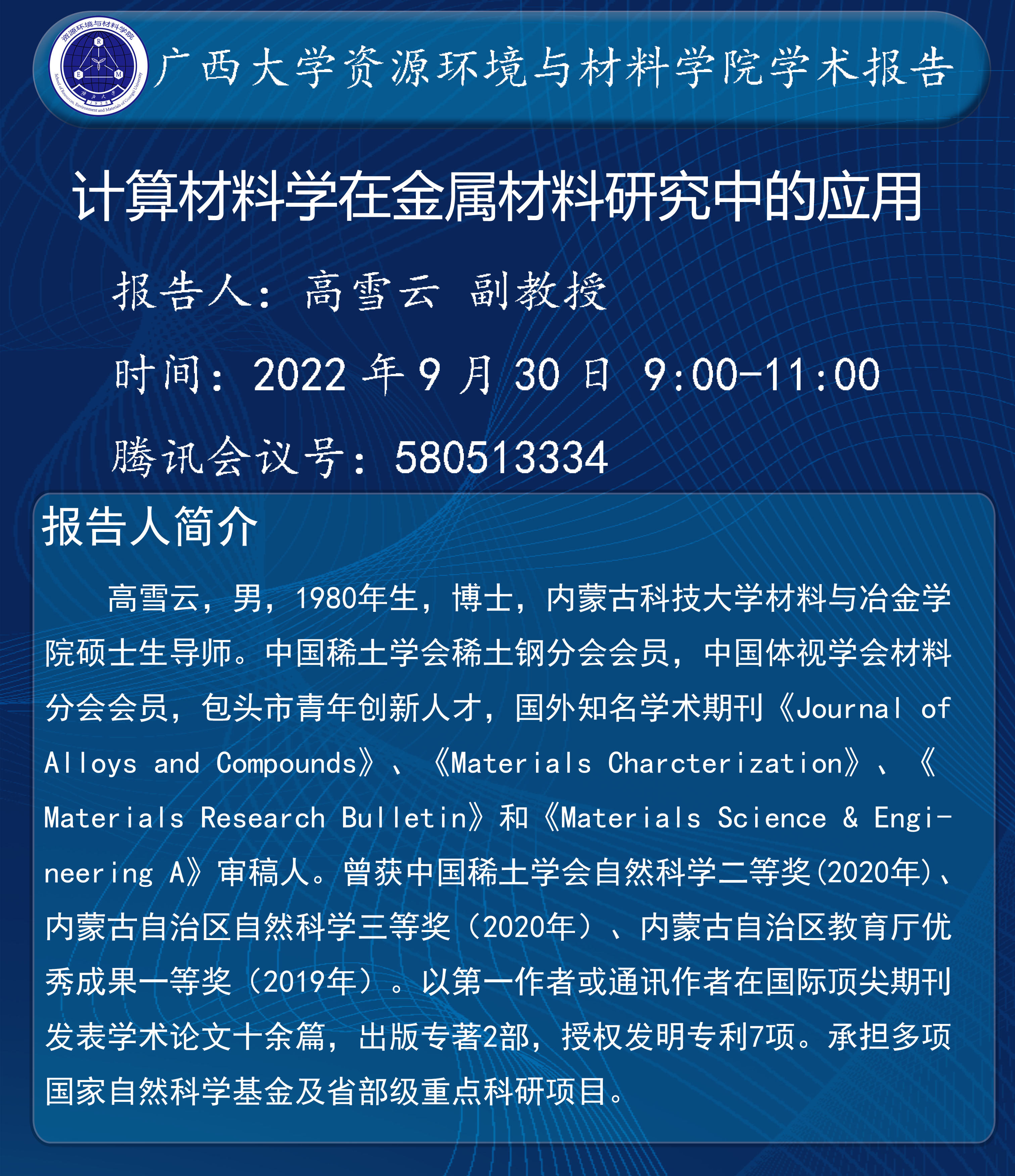 资源环境与材料学院学术报告:计算材料学在金属材料研究中的应用