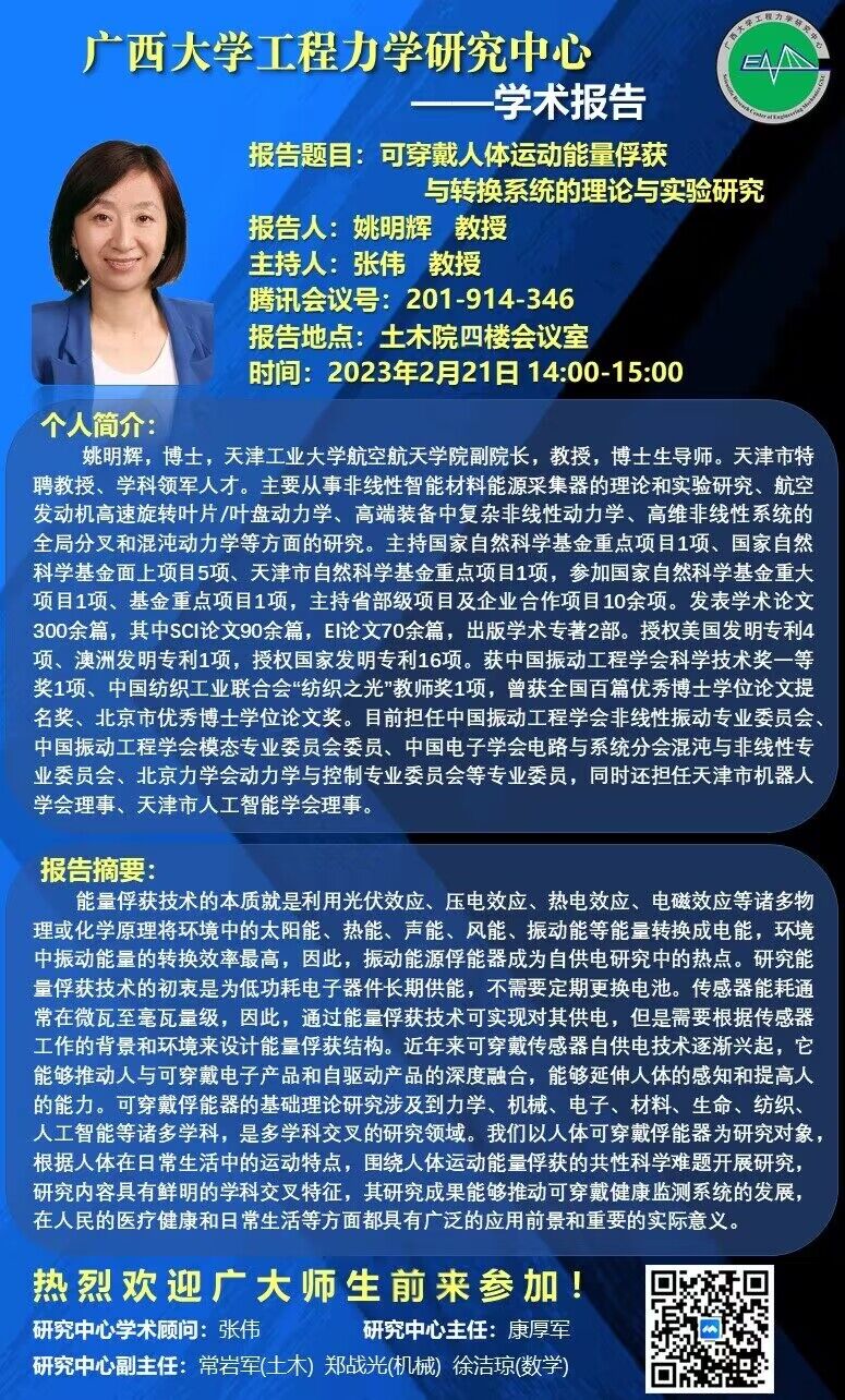 565net必赢客户端工程力学研究中心学术报告:可穿戴人体运动能量俘获与转换系统的理论与实验研究