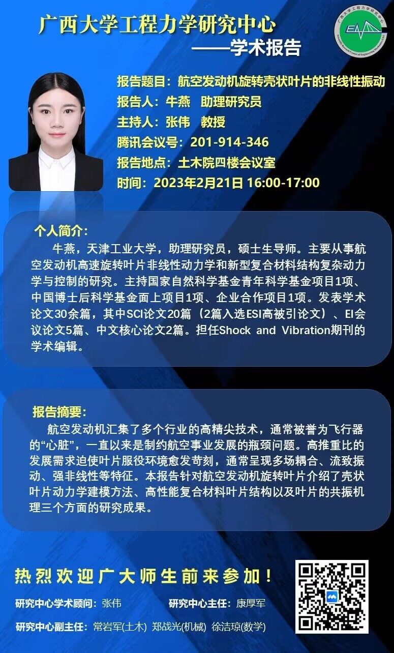 565net必赢客户端工程力学研究中心学术报告:航空发动机旋转壳状叶片的非线性振动
