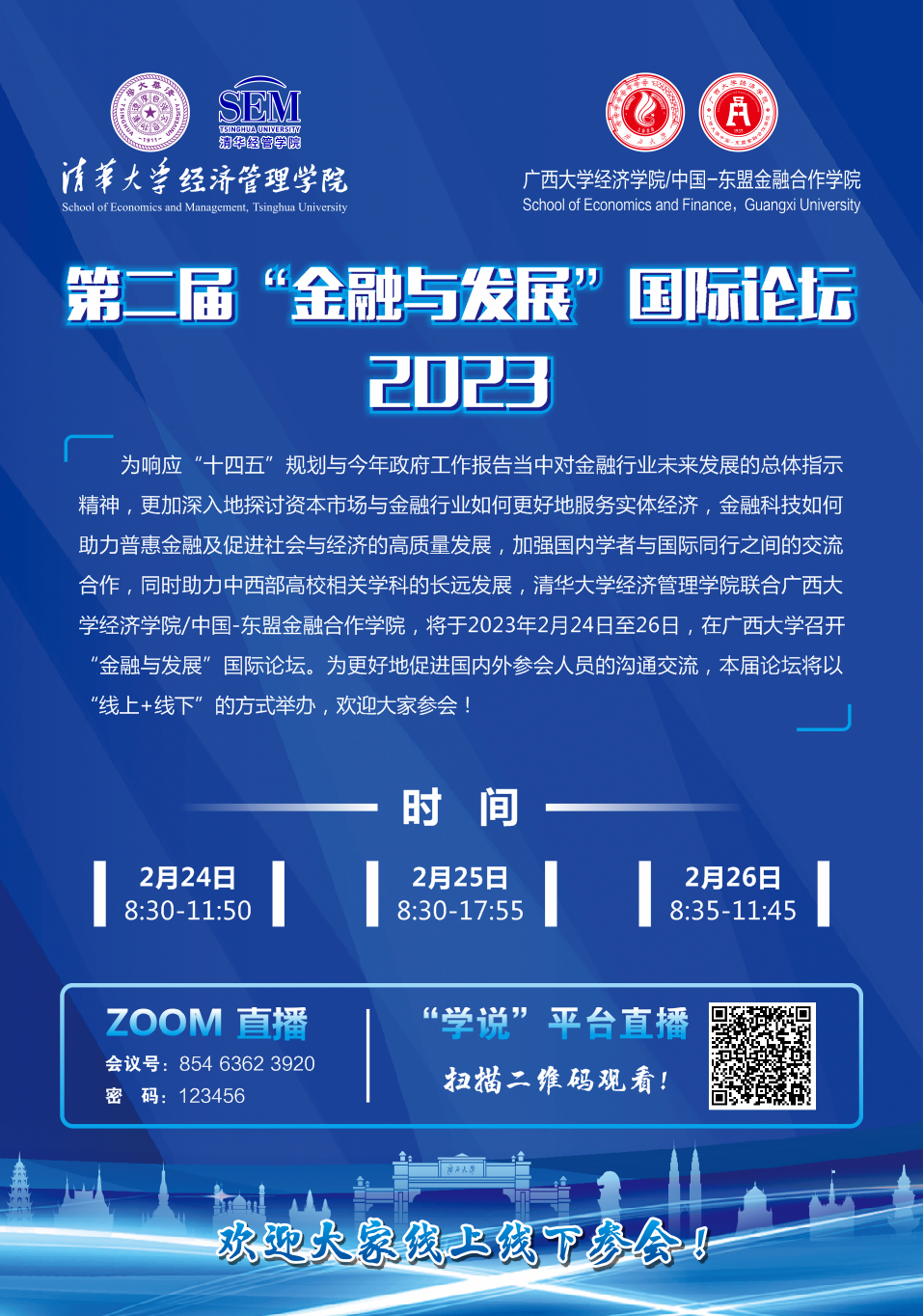 【主办方】清华大学经济管理学院、565net必赢客户端经济学院/中国-东盟金融合作学院【学术活动日期】2023年2月24-26日【时间】2月24日8:30-11:50 2月25日8:30-17:55 2月26日8:35-11:45 【地址】2月24日 565net必赢客户端新闻学院融媒体中心 2月25-26日 565net必赢客户端君武馆