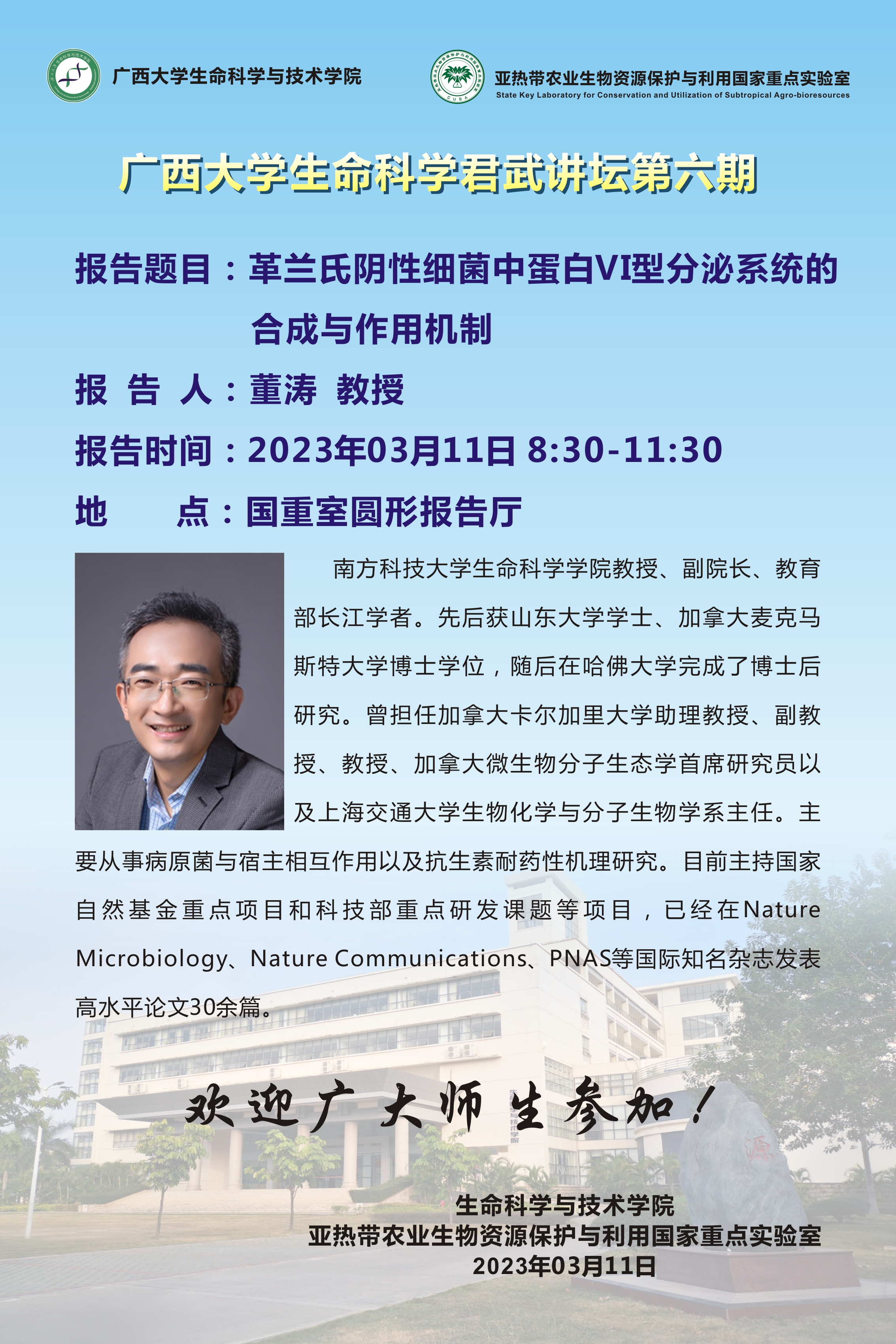 生命科学君武讲坛(第六期):革兰氏阴性细菌中蛋白VI型分泌系统的合成与作用机制