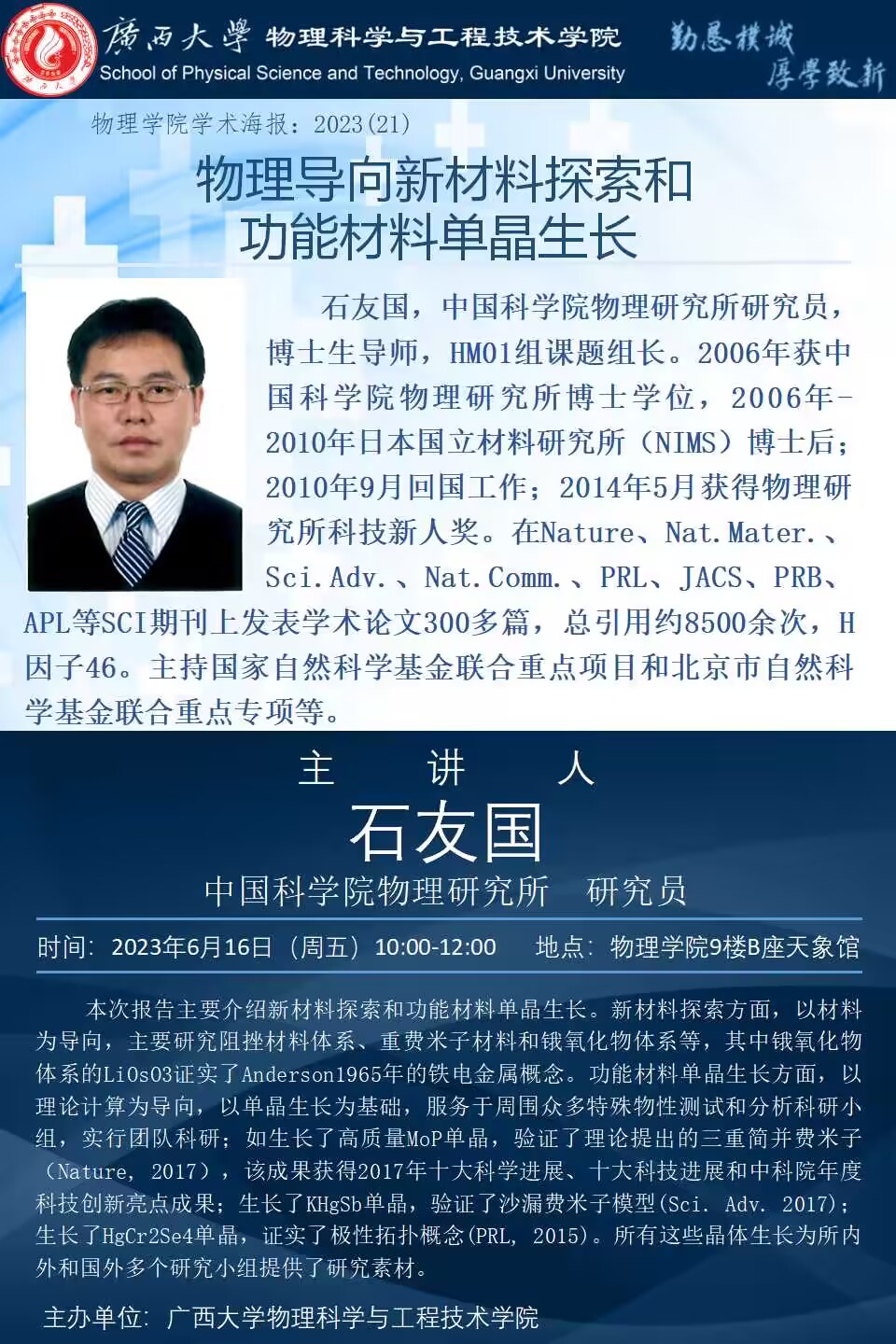 物理学院2023年学术报告系列之21:物理导向新材料探索和功能材料单晶生长