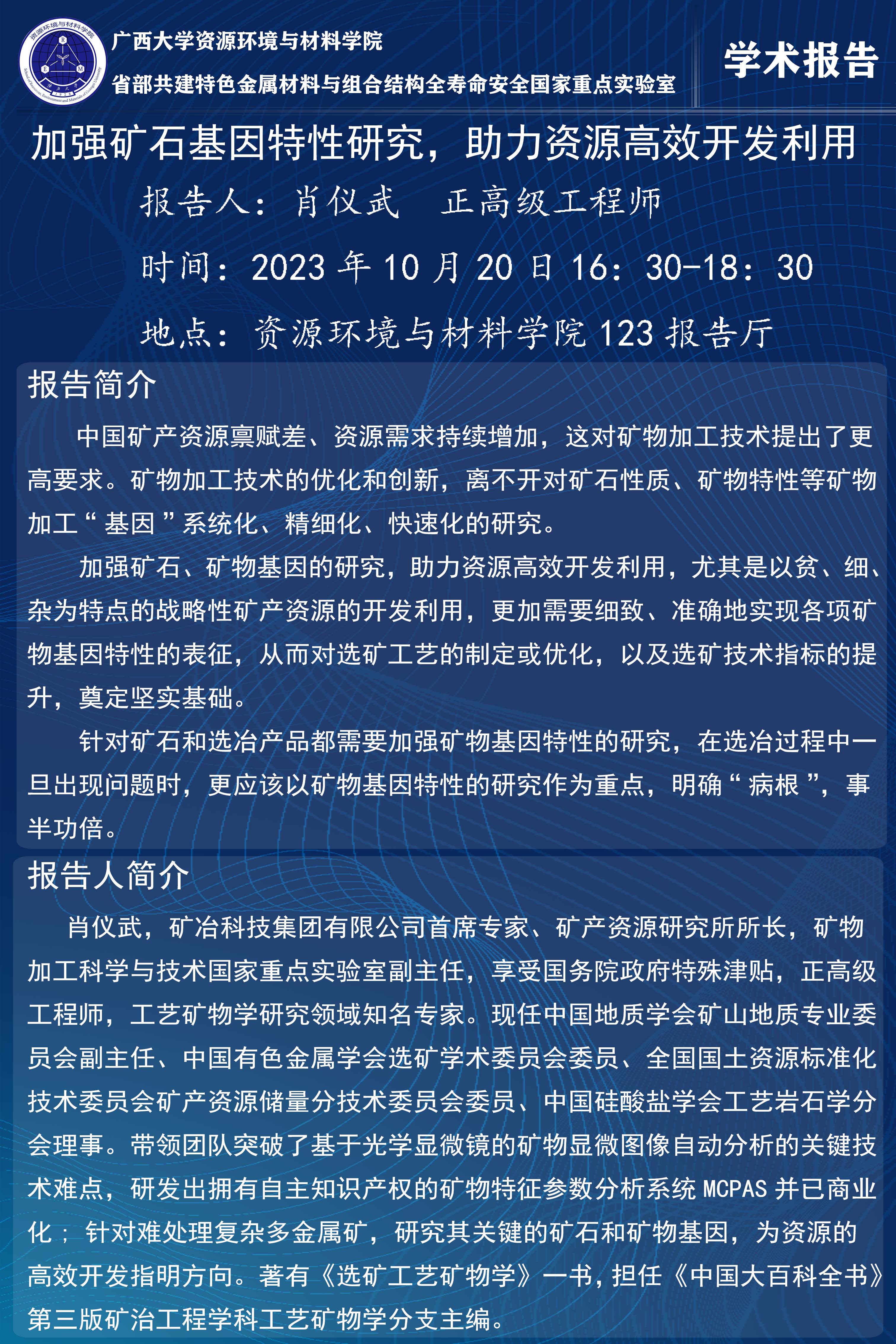 资源环境与材料学院学术报告 :加强矿石基因特性研究,助力资源高效开发利用