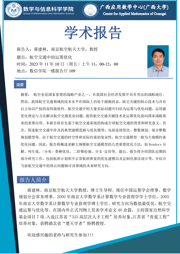 主讲人 蒋建林,南京航空航天大学教授 地址 数信学院一楼报告厅 109