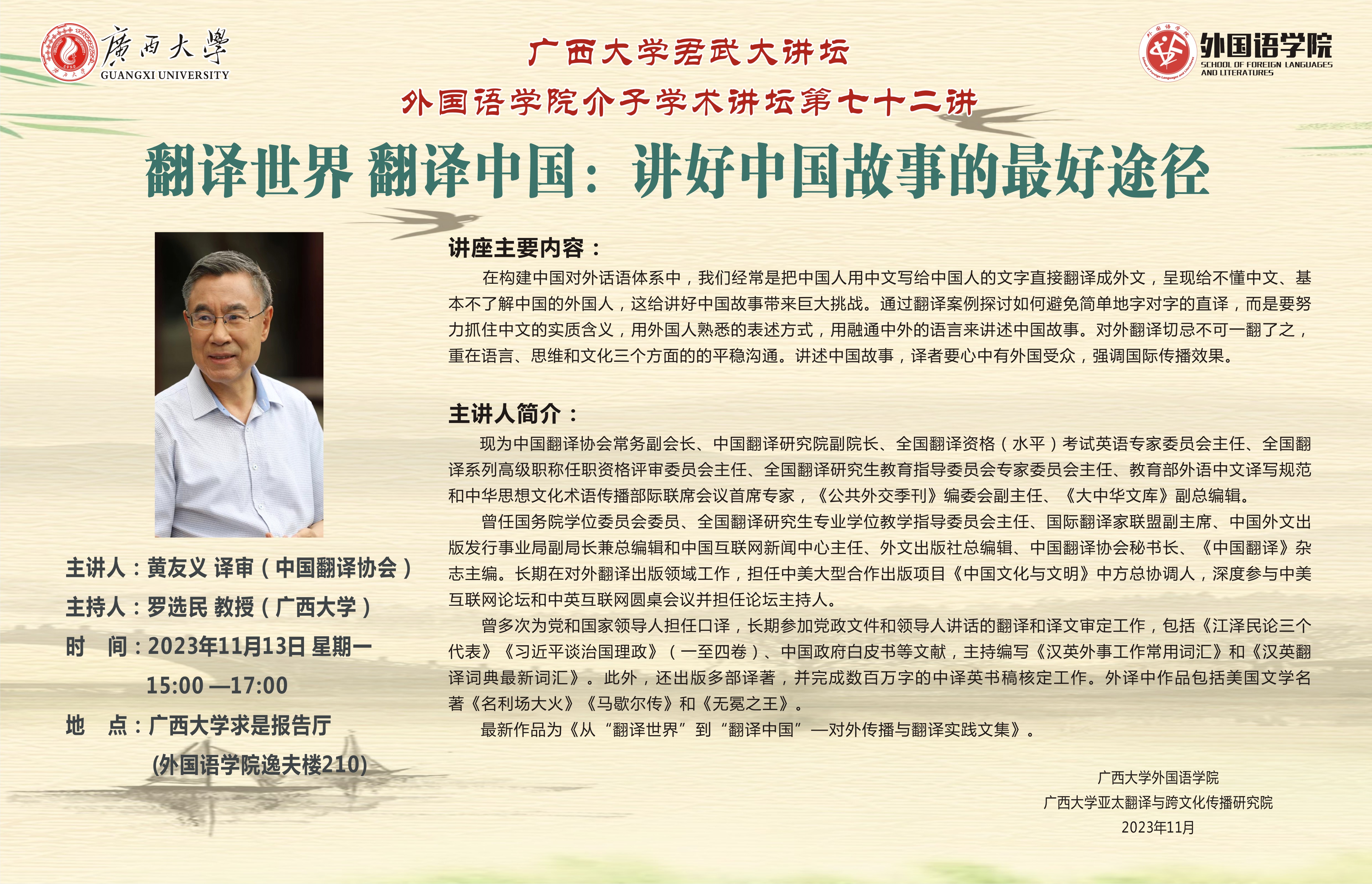 565net必赢客户端君武大讲坛/外国语学院介子学术讲坛第七十二讲:翻译世界 翻译中国——讲好中国故事的最好途径