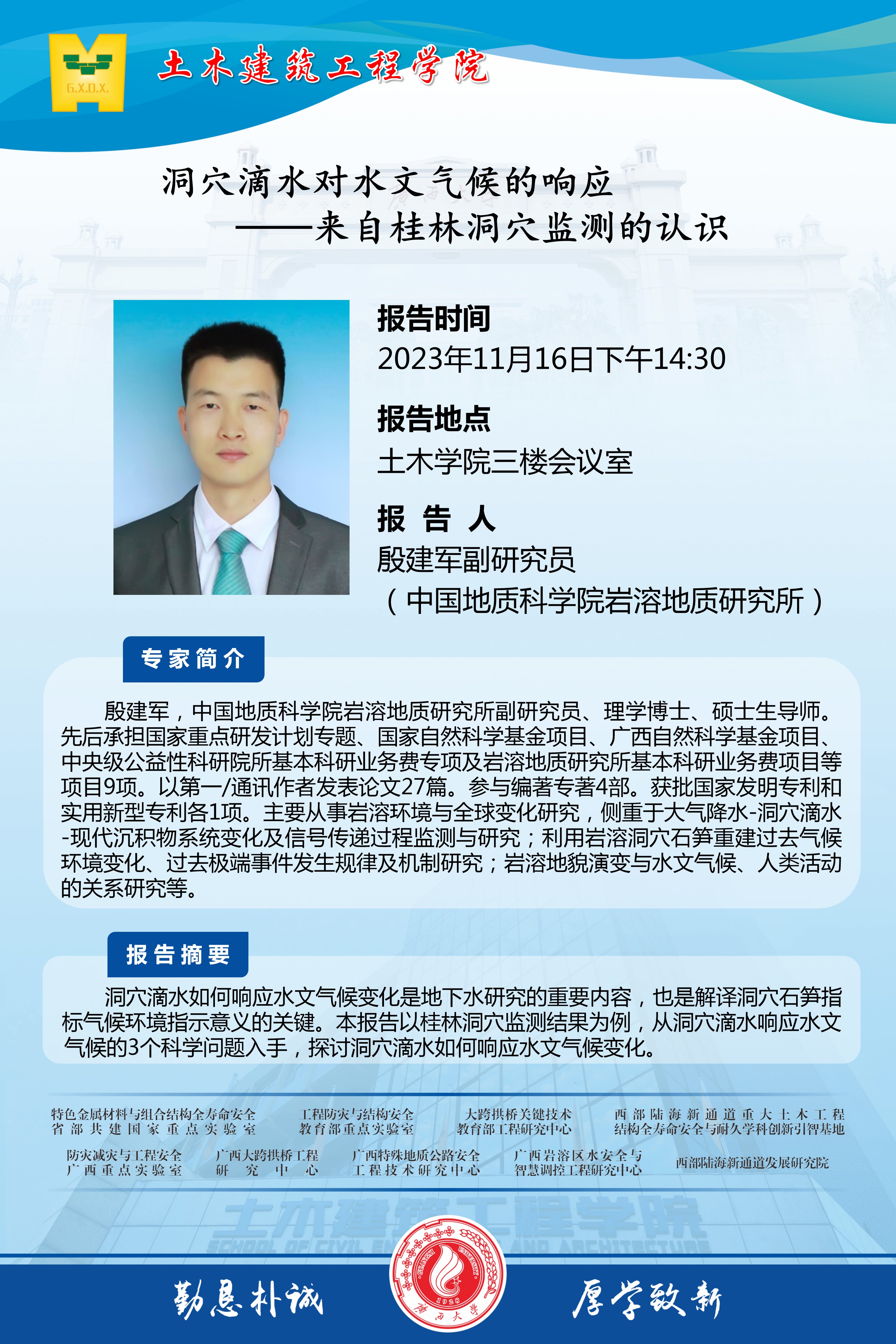 土木建筑工程学院学术报告:洞穴滴水对水文气候的响应——来自桂林洞穴监测的认识