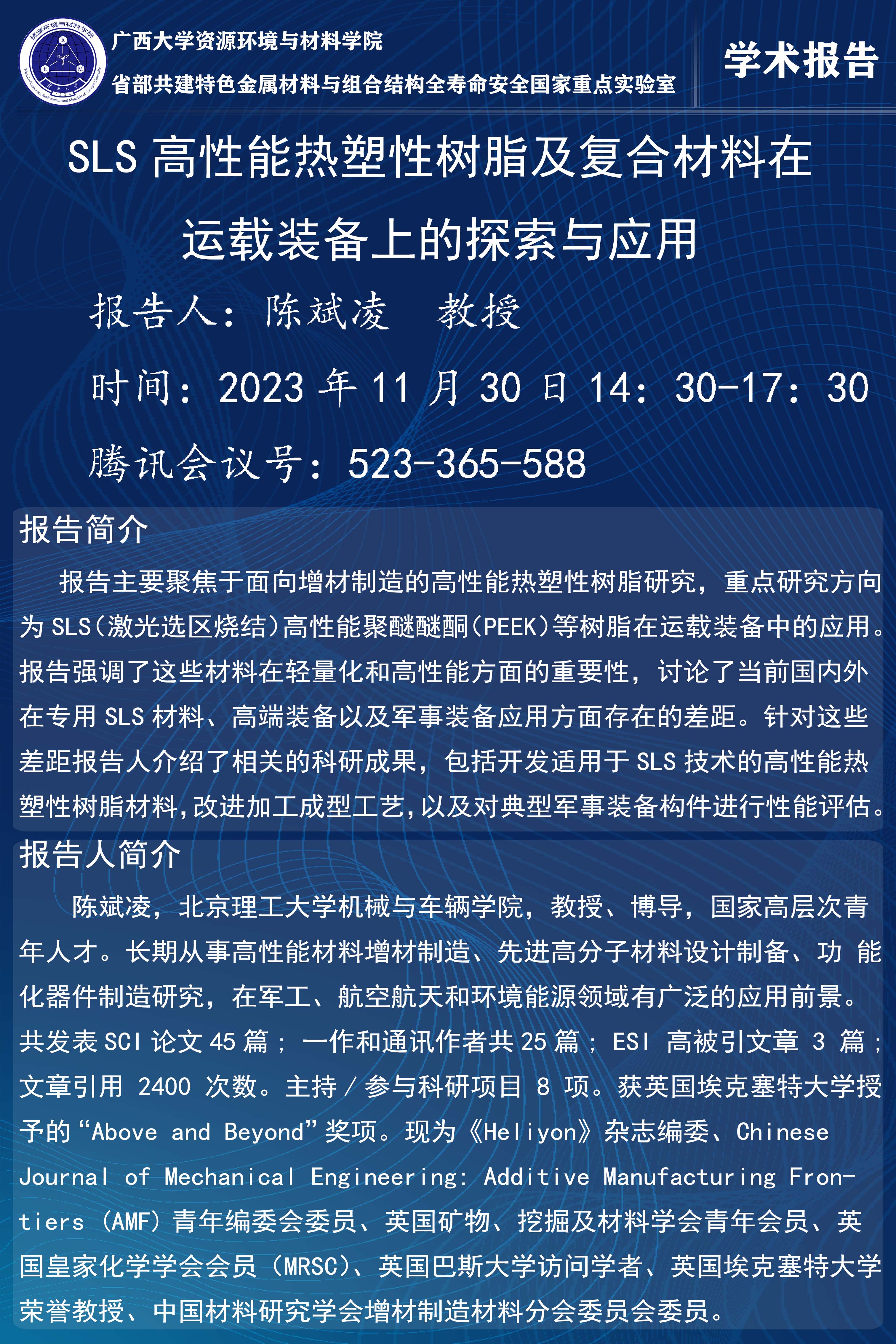 资源环境与材料学院学术报告:SLS高性能热塑性树脂及复合材料在运载装备上的探索与应用