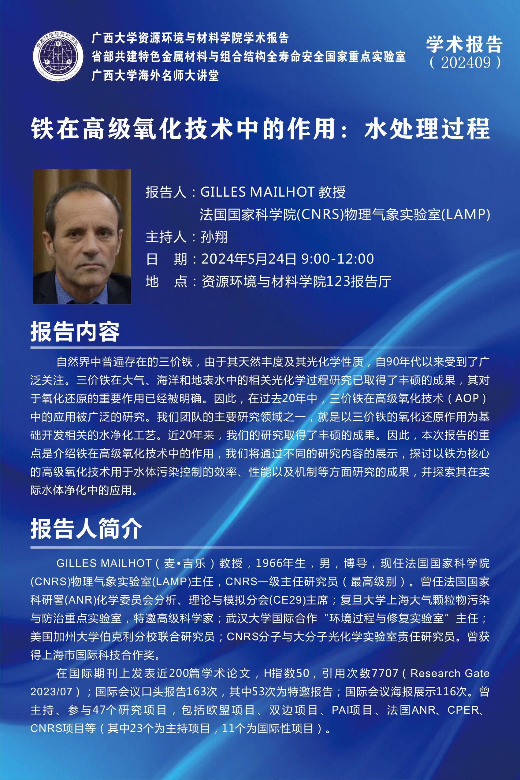 565net必赢客户端海外名师大讲堂、资源环境与材料学院学术报告 :铁在高级氧化技术中的作用----水处理过程