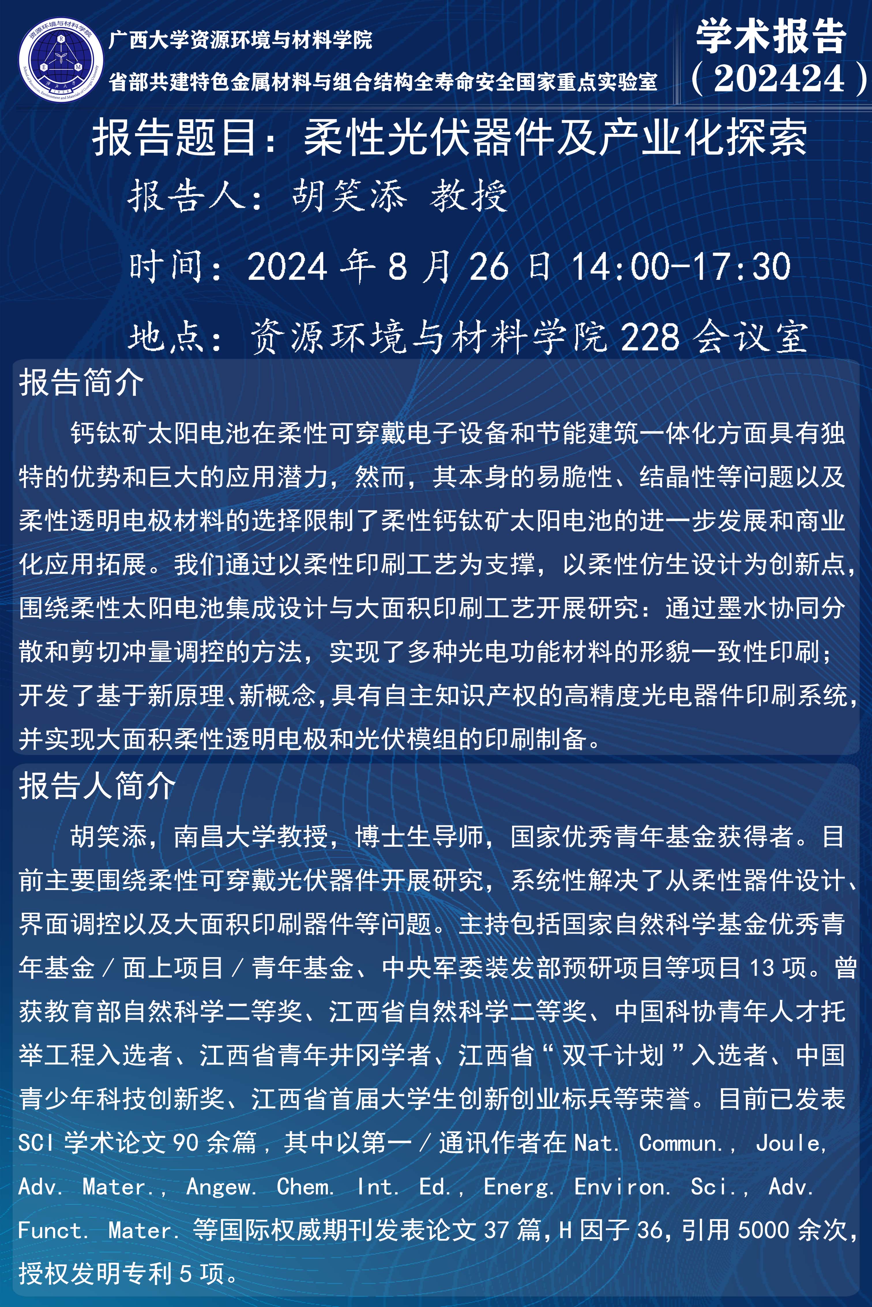 资源环境与材料学院学术报告:柔性光伏器件及产业化探索
