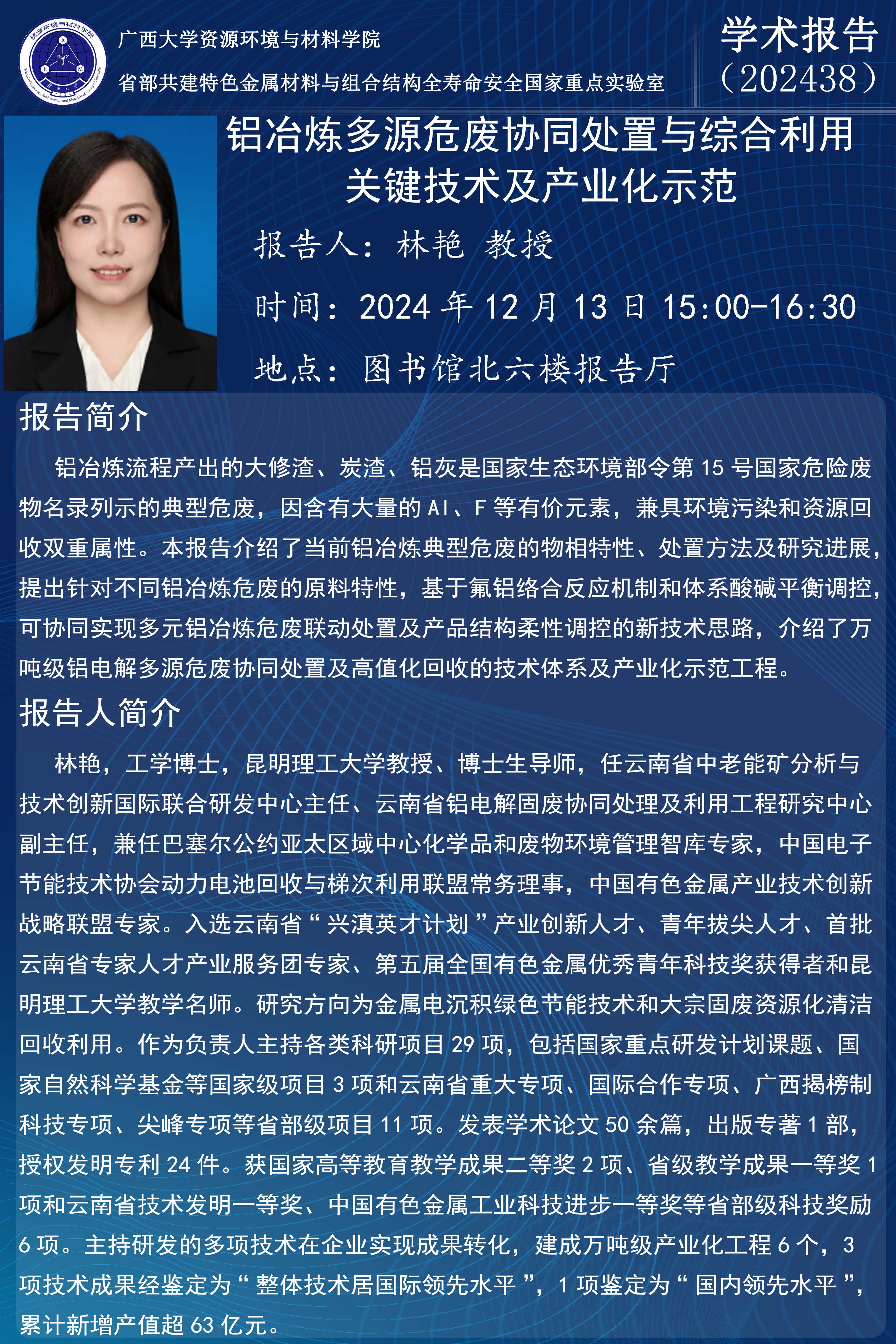 资源环境与材料学院学术报告:铝冶炼多源危废协同处置与综合利用关键技术及产业化示范