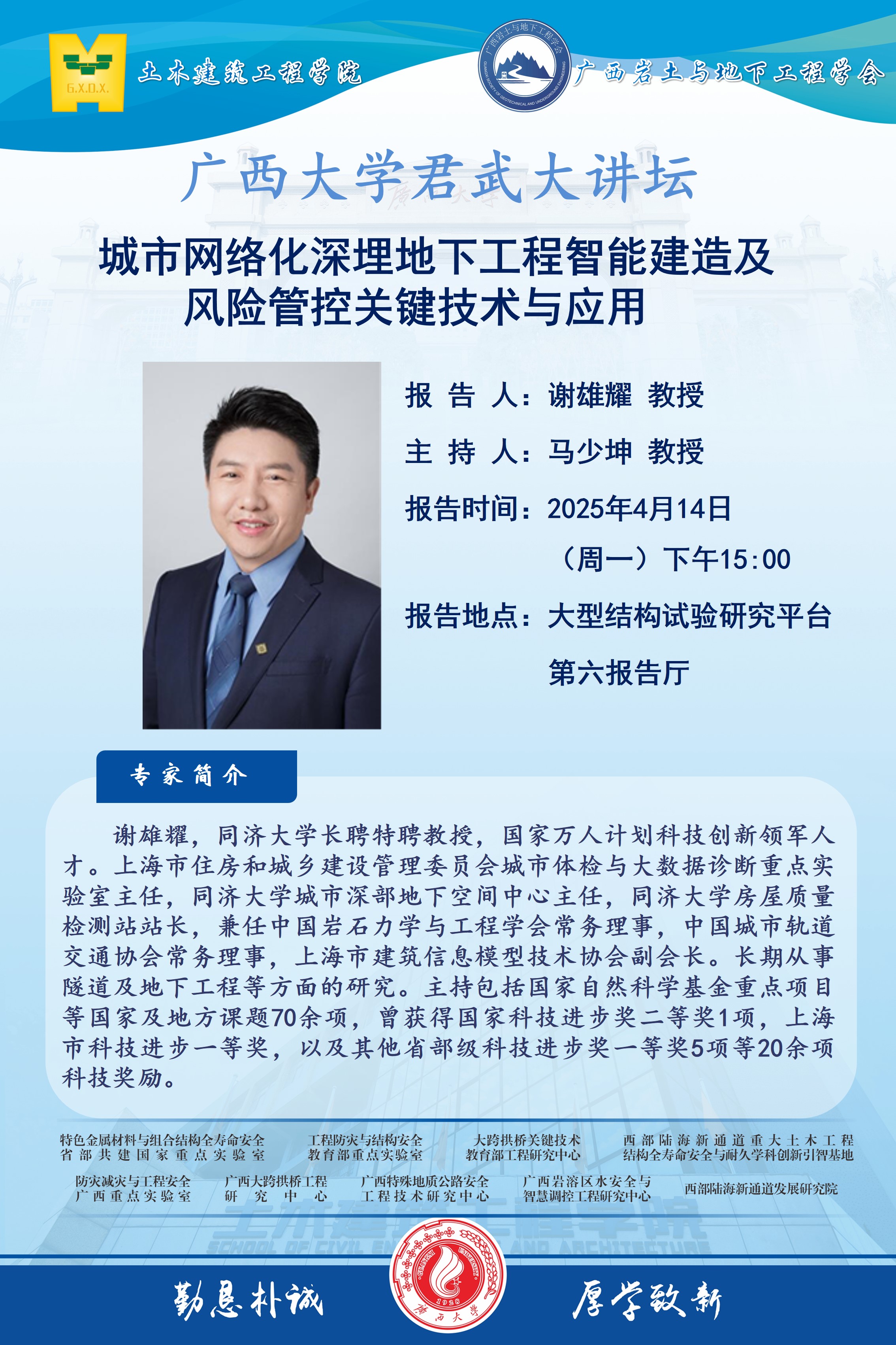 君武大讲坛、土木建筑工程学院学术报告:城市网络化深埋地下工程智能建造及风险管控关键技术与应用