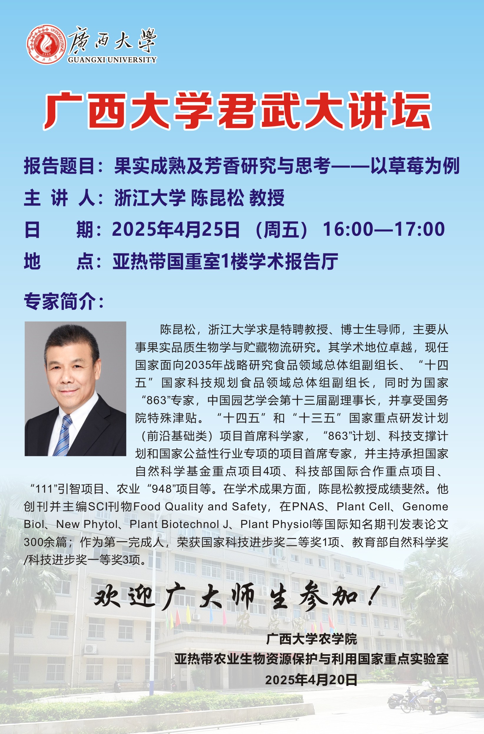 主讲人 浙江大学 陈昆松 教授 地址 亚热带国重室1楼学术报告厅