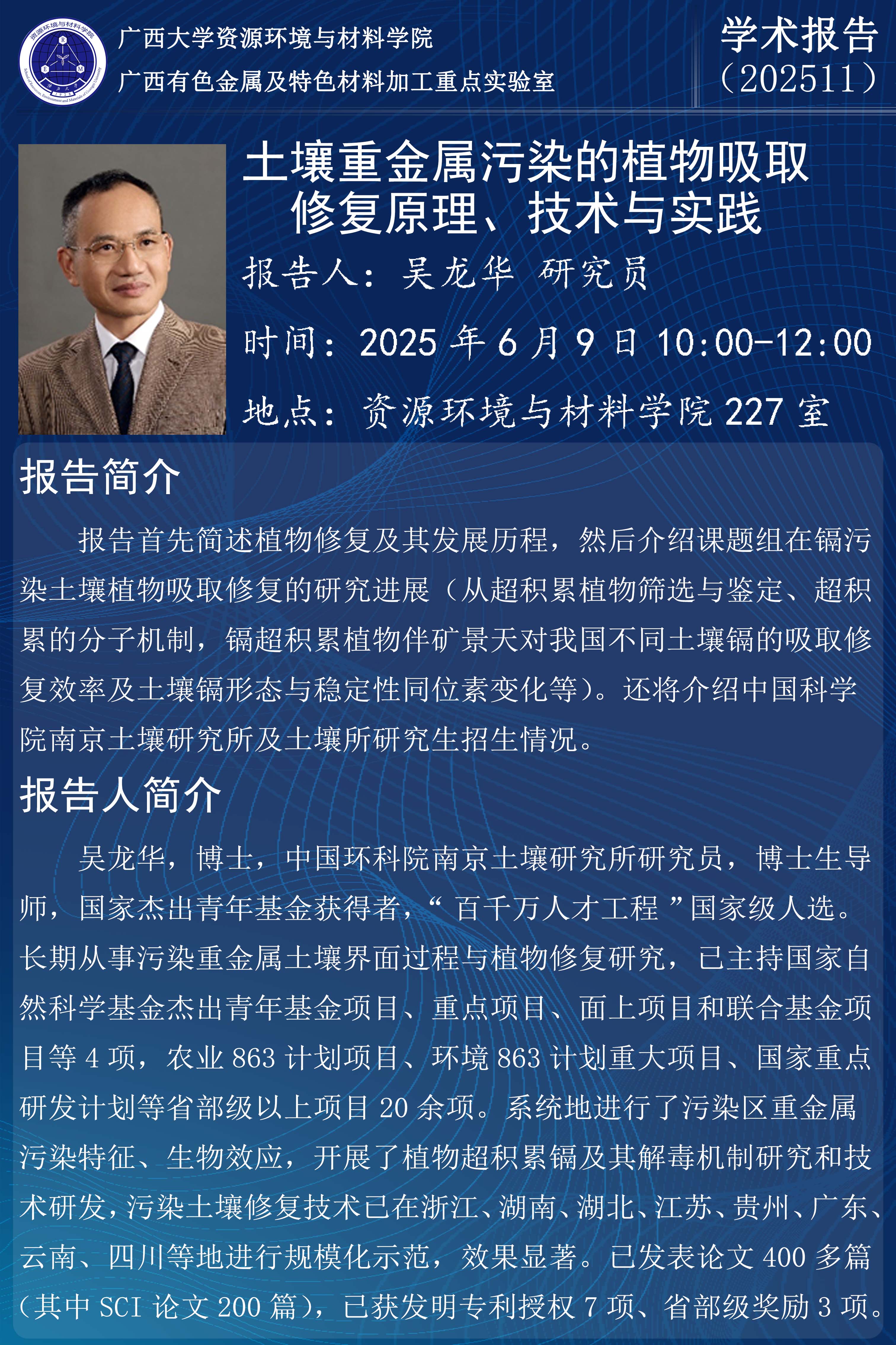 资源环境与材料学院学术报告:土壤重金属污染的植物吸取修复原理、技术与实践