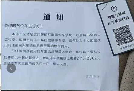 近日,我处接到教职工反映,校内有人将《智能互联网停车系统扫码》卡片(附件1)放在汽车上,提示车主用微信扫码交费。保卫处温馨提示:
