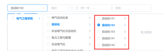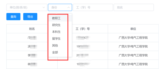 “身份”下拉选项框中可选择具体的身份类型(教职工、本科生、研究生等)查询相应的人员填报信息。也可在“单位”下拉选项框中选择具体的班级(研究生或本科生班级)查询该班级的人员填报