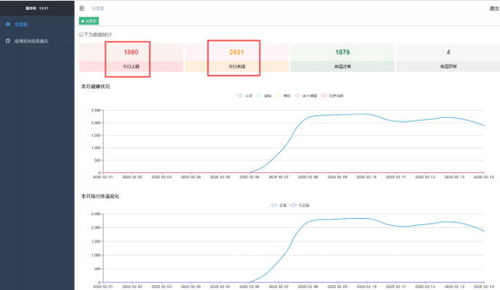 各单位相关负责人登录系统后(登录地址和帐号已发给各单位办公室主任),可在首页的“仪表盘”查看本单位教职工和学生今日 “健康打卡” 填报和未填报的人数。 点击“今日上报”和“今日未报”,会弹出 今日已填报和未填报的 人员名单,可按需查询。