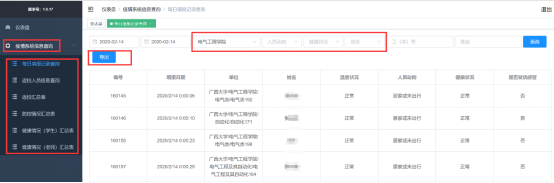 点击左侧菜单,可查询、统计和导出相应的 每日填报记录、健康状况汇总表。点击“导出”按钮可导出查询结果的excel表格。